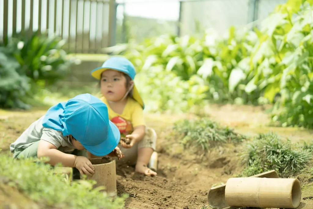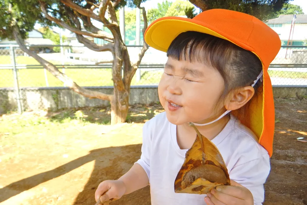 かもと乳児保育園では、幼児期には、五感を全開で機能させて、自然の中にある「色」「形」「音」「匂い」を感じ取り「不思議だなぁ」と感じる身体的感覚を目覚めさせます。