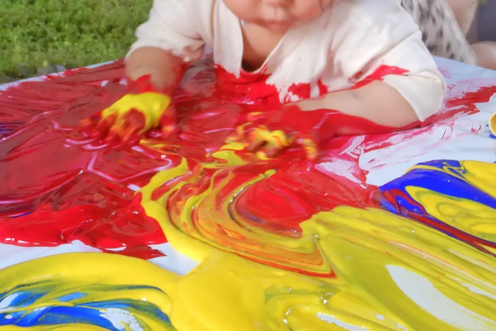 絵には子どもの個性や性格までもが反映されています。早い場合、生後8~9カ月くらいの時期に、絵具を手や体に塗ったり、身のまわりや画用紙に点などをうったりします。その点は様々な線へと変化していきます。